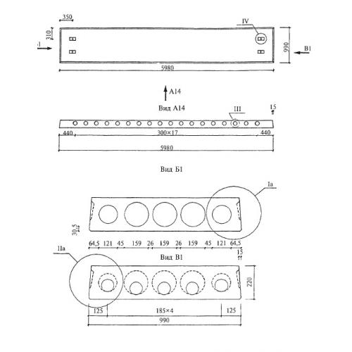 Плиты длиной 5980 мм и шириной 990 мм с напрягаемой арматурой из стали классов  A-IIIв, A-IV, Ат-V , из тяжелого бетона.  Метод натяжения - электротермический.